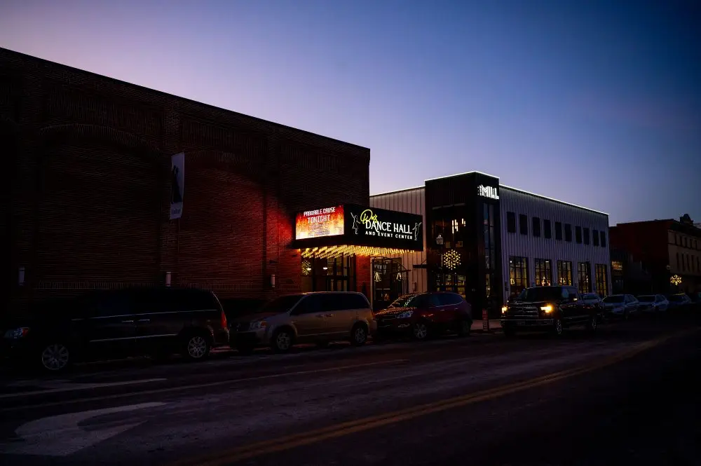 A custom-fabricated, canopy-style marquee featuring an internally illuminated, routed face with 1″ acrylic push-thru copy and logos. Additionally, it includes dual fully programmable electronic message centers on either side. For an artistic touch, stamped zinc rosette detailing lines the lower perimeter. The illuminated ceiling of the canopy is fitted with 134 LED theater marquee bulbs.