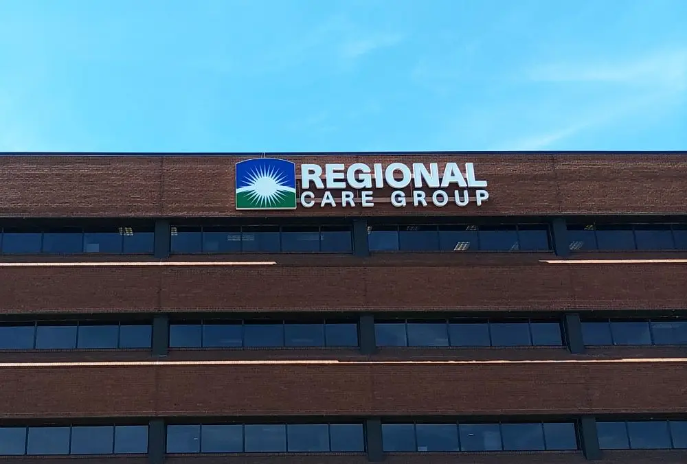 Four sets of face-lit channel letters and logo mounted to raceways 30′ up on building facade.