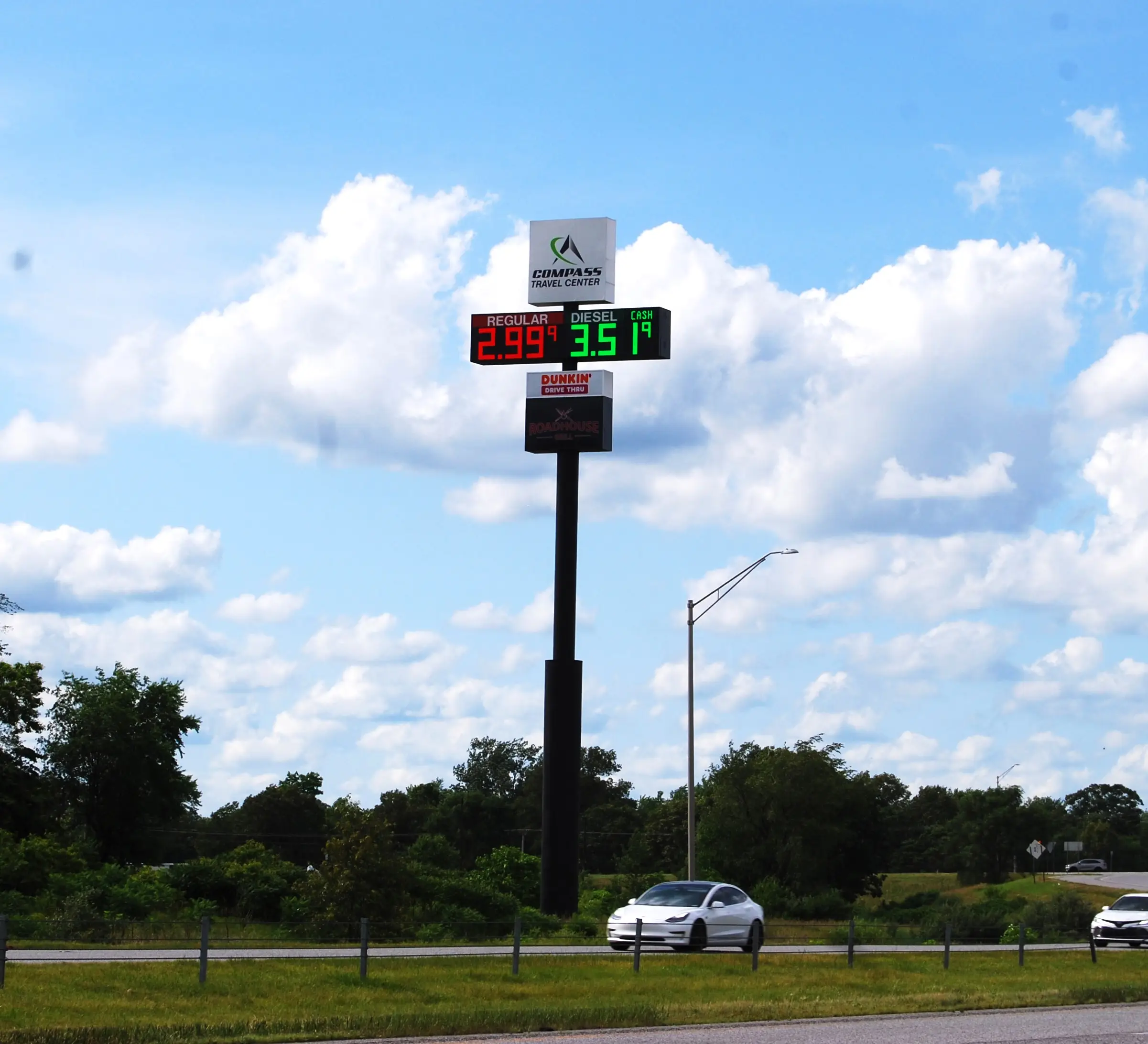 Three double flex face internally illuminated sign cans and price changers mounted onto a 115′ tall sign pole.
